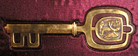 This is an artistically crafted metal key measuring 27 centimeters. On one side of its handle is a relief of the kneeling angel with a cross in its hand, while the other side has the words "MESTO PRIEVIDZA" (City of Prievidza). This symbol is used at especially important welcoming ceremonies for official visitors to the city.