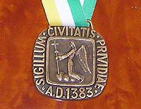 This is a medallion produced from golden metal that hangs on a tri-colored ribbon of yellow, white and green, the city's colors. The medal is artistically crafted with a kneeling angel in a square at the center holding a single-barred cross in both hands, its arms raised forward. Above the angel's head is an aureole. Around the square is inscribed the words SIGILLUM CIVITATIS PRIVIDIAE 1383.