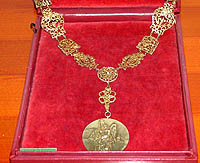 This symbol is only used by the City Mayor at official ceremonies and at events significant for the entire city which are either organized by the city within its territorial jurisdiction or in which the city participates. This insignia was produced in the mid-20th century at Sandrik in Dolné Hámre. It is made from white metal and artistically crafted. When it was produced, original silver clasps and brooches were used. These were part of the outfits worn by residents of Prievidza up to the beginning of the 20th century. The chain is also adorned with precious jewels from the collection of a former functionary in the City National Committee, Gregor Králik, who donated them to the city for this purpose. On the chain's pendant is a medal with the symbol of the city, executed according to a design created in 1946 by an academic artist, Vladimír Vestenický. The motif of a kneeling angel with a cross is derived from the city's original symbol, though the angel is kneeling not on rocks but on a cogged wheel from a stamp mill, commemorating the clothing and textile industry which flourished at one time in Prievidza. On both sides of the angel's figure are silhouettes of Prievidza's church towers.