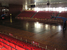 - The main playing area is a combined court for basketball, volleyball, team handball and indoor football, measuring 45 x 25 meters and 11 meters high. It is equipped with a suspended spring board floor. The bleachers seat 1,900. The hall meets standards for international meets.